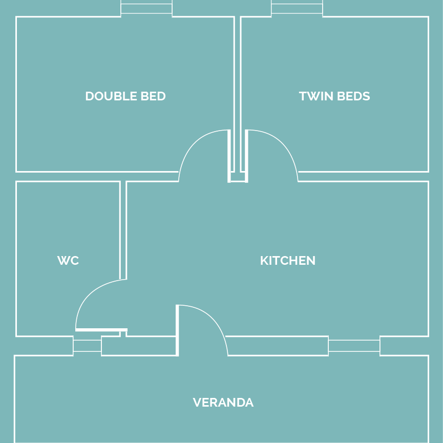 All our bungalows will be air conditioned from summer 2019. Recently built, they are designed to easily host up to 5 people. Made of masonry, they include two bedrooms (4 beds), one bathroom, living room and kitchen fitted with everything you need to prepare your meals. The living room features a sofa bed that can be made up for the 5th guest. The veranda is furnished with table and chairs for restful moments outdoors. Water, gas, TV and car parking space are included in the cost.